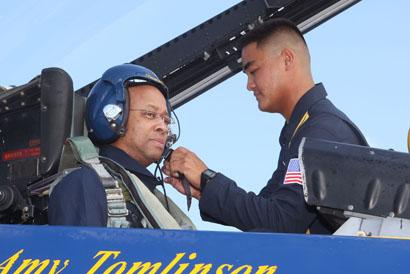 AM3(AW) Daniel Pascual, Crew Chief for Blue Angel Number Seven secures Edward Key, Director of Enrollment Management at Broward College prior to his media flight in Blue Angel number seven Oct 13. AM3 Pascual was here as a part of the Blue Angel Flight Demonstration Team performing at the "Wings Over Atlanta" Open House and Airshow Oct 16-17. (U.S. Air Force Photo/Don Peek)